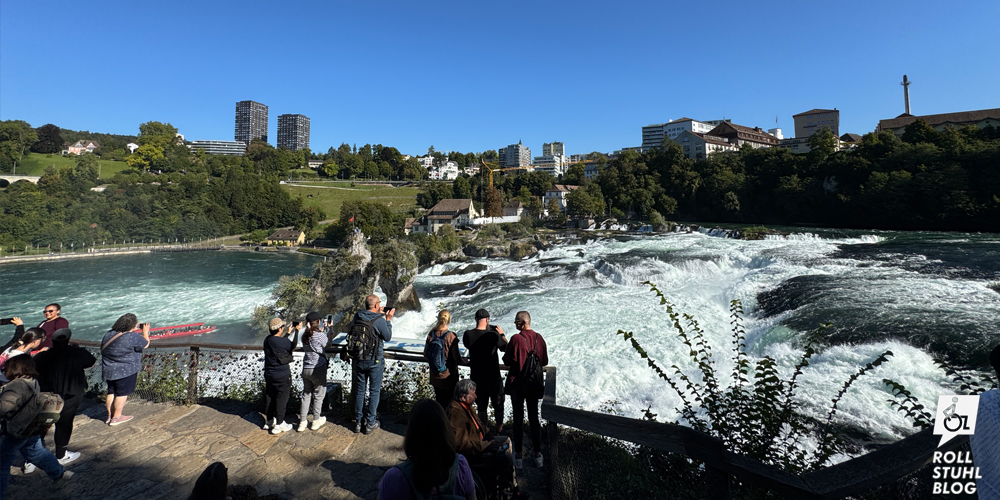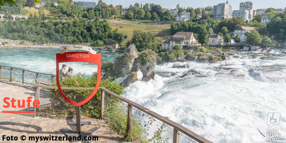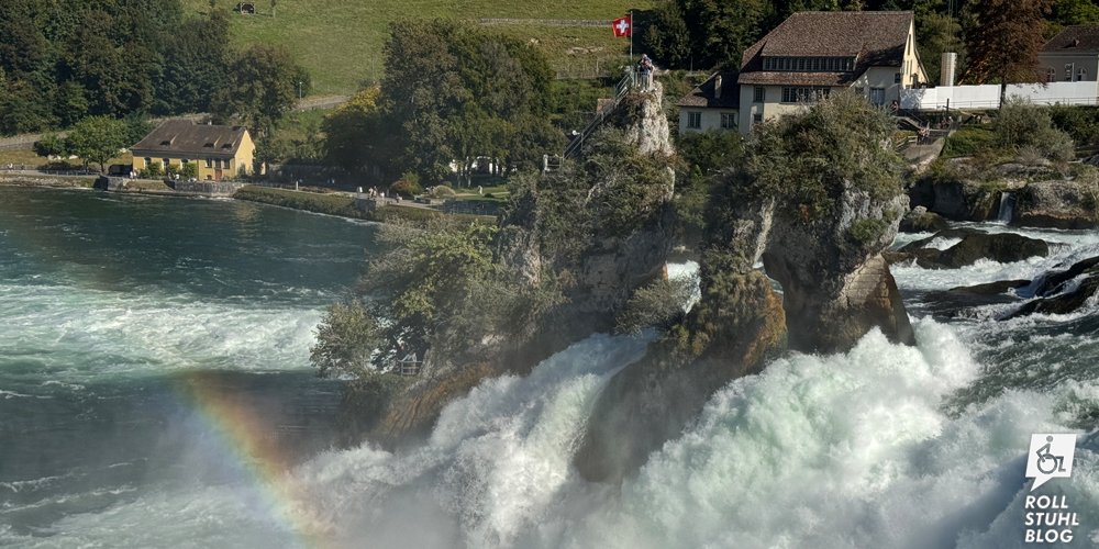 Der Rheinfall in der Nähe von Schaffhausen ist einer der mächtigsten Wasserfälle Europas. Wir parkieren auf dem grossen Parkplatz beim Schloss Laufen und freuen uns: Die Eintrittstickets für Menschen im Rollstuhl und für eine Begleitperson sind kostenlos. Das Getöse des Rheinfalls wird immer lauter, je näher wir kommen. Ein Schild mit Rollstuhl-Symbol weist uns den Weg zu den beiden Liften, die uns nach unten zur Aussichtsplattform bringen. Das Drehkreuz mit Rollstuhltüre öffnet sich beim Scannen des Tickets. Der Blick auf den Rheinfall ist wirklich eindrücklich. Schade: Der «Grand Tour of Switzerland»-Fotospot steht auf einer erhöhten Plattform, die nur über Stufen erreichbar ist. Das hätte besser gelöst werden können.