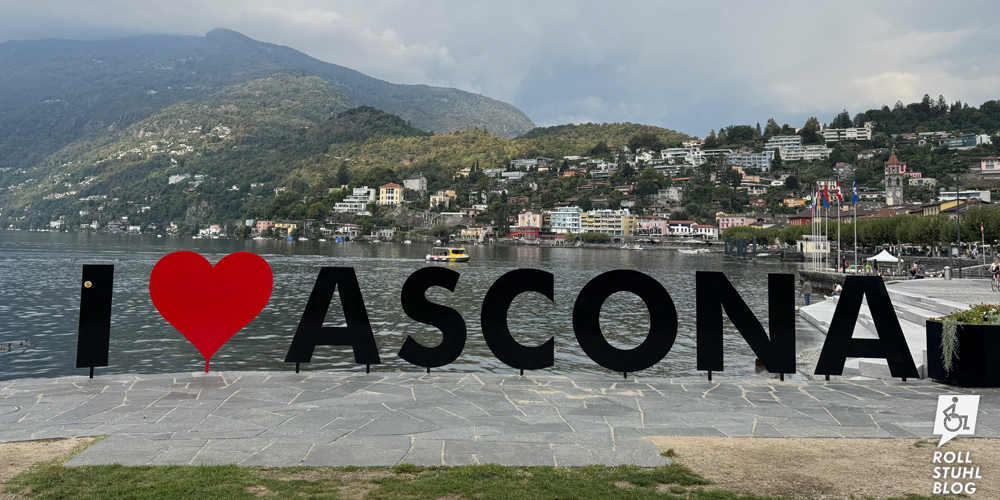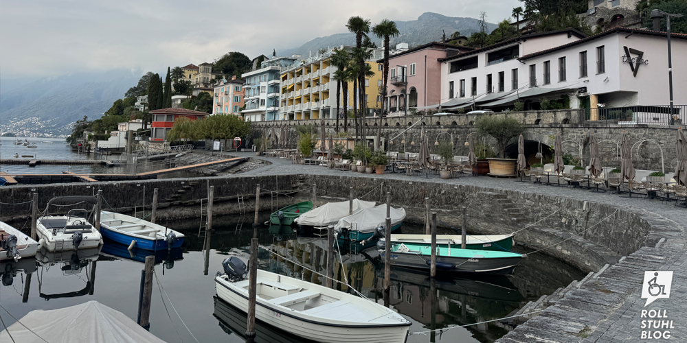 Die Tessiner Kleinstadt liegt direkt am Lago Maggiore, hat eine wunderschöne Altstadt mit farbigen Häusern und eine malerische Seepromenade. Hier steht ein bisschen versteckt auch der «Grand Tour of Switzerland» Fotostop. Die Altstadt ist autofrei. Aber es gibt viele Behindertenparkplätze und wir fragen uns, ob wir vielleicht doch mit dem Auto hätten hineinfahren dürfen. Leider gab es dazu keinerlei Informationen, was ein bisschen schade ist. Wir spazieren die Seepromenade entlang und finden beim hinteren Parkplatz eine öffentliche Toilette, die auch rollstuhlgängig ist.