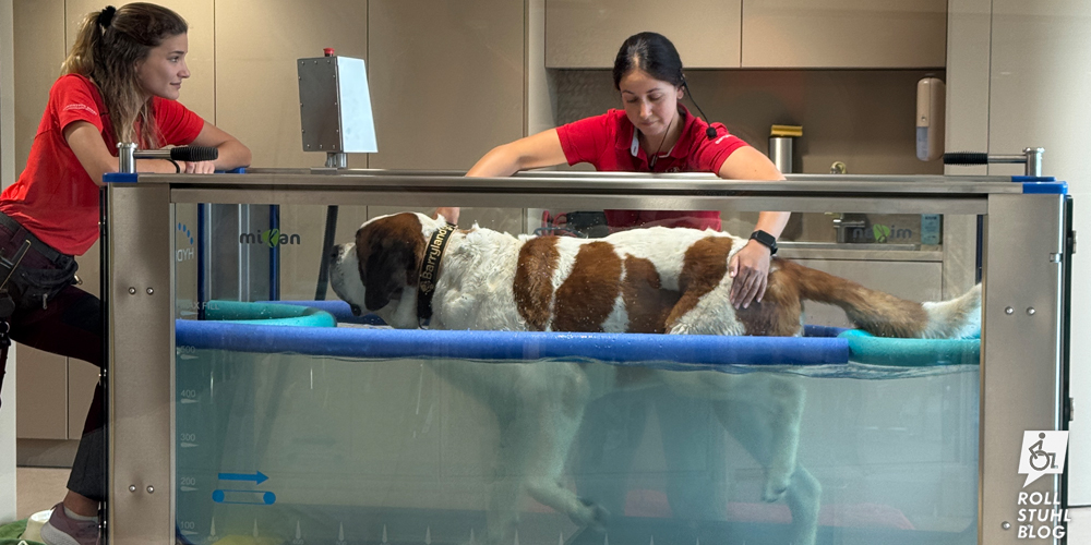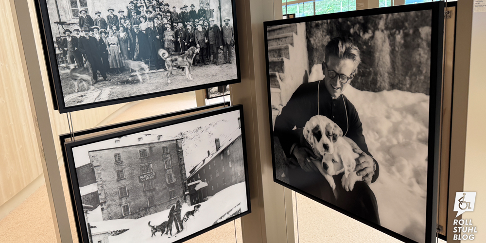 Im Hospiz auf dem grossen Sankt Bernhard leben weiterhin Nachkommen des legendären Rettungshunds Barry. Aber nicht nur dort: Im neu gebauten Besucherzentrum in Martigny sind sie besser erreichbar. Im oberen Stock wohnen tagsüber die Hunde, abends kommen sie zurück zu ihren Familien, bei denen sie in ihrer Freizeit leben. Durch die Glasfront können wir sie in verschiedenen Räumen beobachten, während sie schlafen, spielen oder anderweitig beschäftigt sind: Syrah kommt gerade zur Aqua-Therapie. Die Hundedame ist achtjährig und damit bereits in einem höheren Alter, in dem Bernhardiner oft Gelenkprobleme haben oder nicht mehr gut aufstehen können. Wir können bei der Aqua-Therapie zuschauen und erhalten gleich noch viele Informationen dazu. Lift und Behindertentoilette sind natürlich vorhanden – auch im Restaurant «Café de Barry» mit tollem Essen.