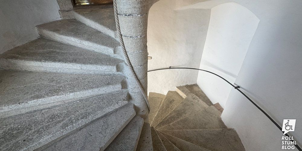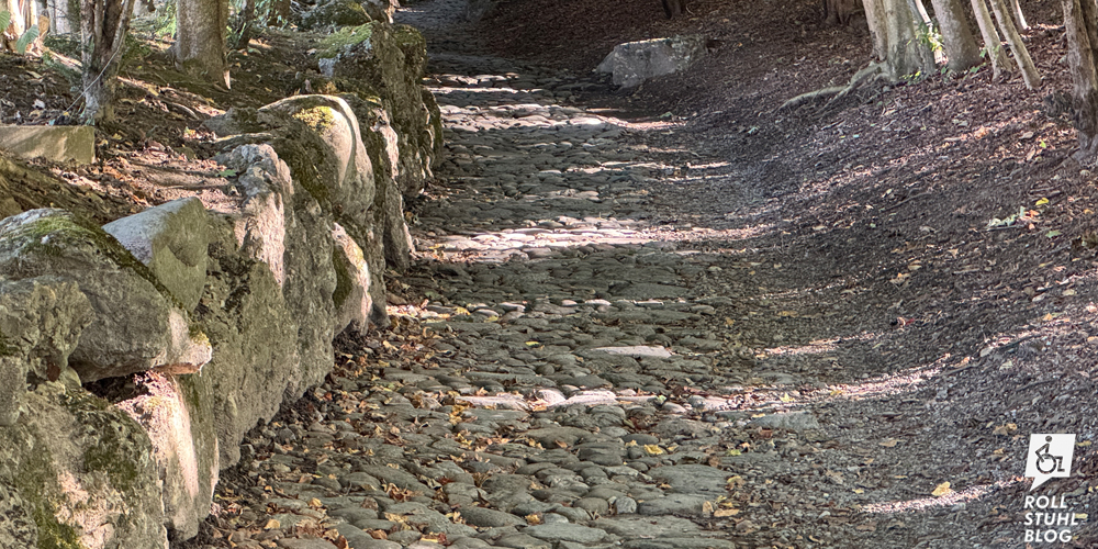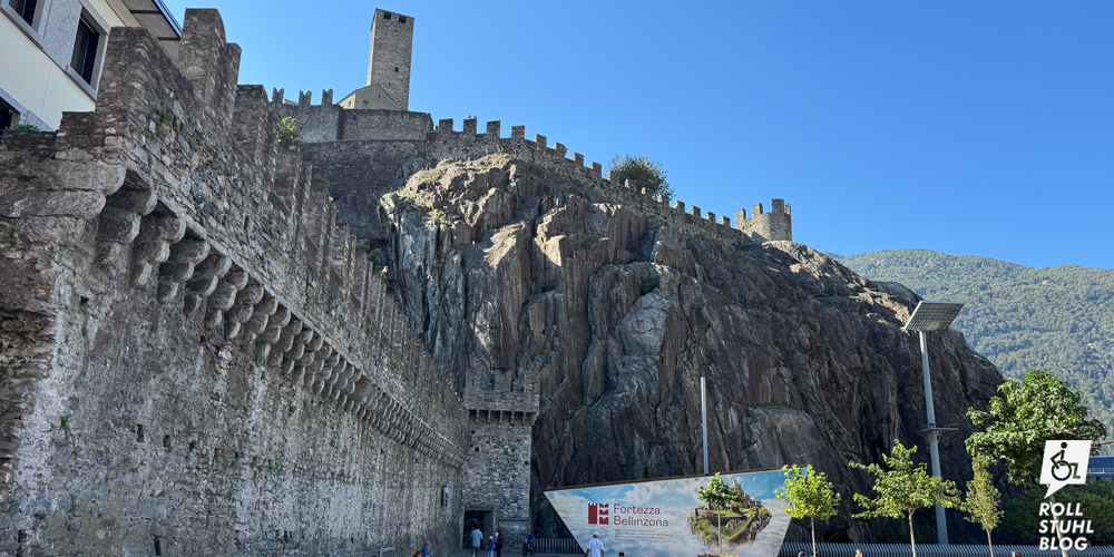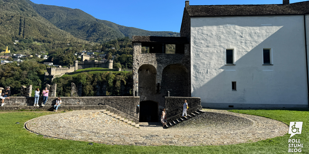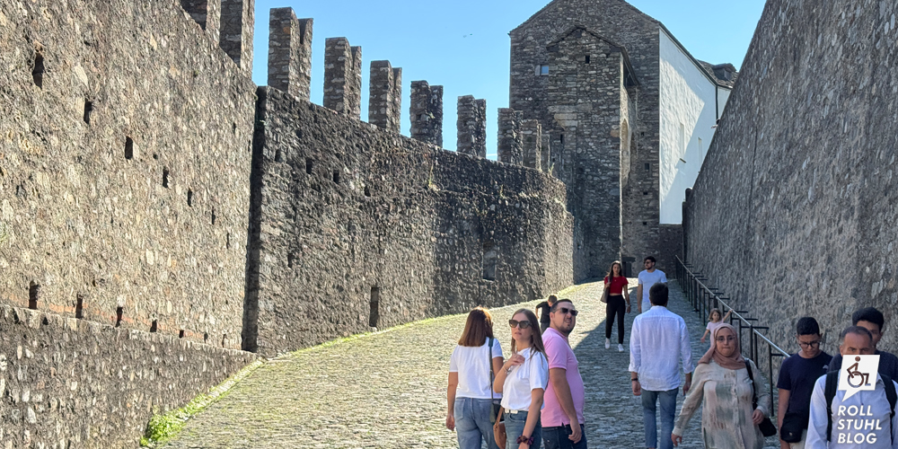 Wir wollen das Castel Grande auf einem grossen Felsen hoch über der Altstadt besuchen. Der Zugang mit dem Rollstuhl ist durch eine Grotte mit Lift möglich. Oder doch nicht. Denn der Lift führt nicht bis zur Wiese rund um die Burg, sondern nur bis zu einer Rampe unterhalb. Mit ihren runden Pflastersteinen und dem Gefälle ist sie im Rollstuhl nicht passierbar. Hätte der Lift nicht weiter drüben gebaut und in eines der Gebäude führen können? Ohne Gabi erkunden wir die Burg und stellen fest: Auf der Rückseite gibt es eine Strasse und einen Behindertenparkplatz. Eine Info dazu haben wir vergeblich gesucht. «Die direkte Zufahrt zur Burg mit Kraftfahrzeugen ist nicht gestattet», steht auf der Website, und unten an der Strasse ist ein Fahrverbot ausgeschildert. Schade: Möglich wäre es also, aber offenbar soll niemand davon erfahren.