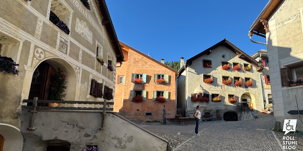 Aus dem herzigen kleinen Bündner Dorf hoch über dem Tal stammt Schellen-Ursli aus dem beliebten Kinderbuch. Wir suchen die Türe vom Umschlagbild. Und tatsächlich haben hier fast alle Haustüren diesen speziellen Stil und sind wunderschön. Das Dorf ist autofrei und eigentlich müssen alle Touristinnen und Touristen ihr Fahrzeug auf dem grossen Besucherparkplatz weiter unten zurücklassen. Ein Parkplatz-Schild mit Rollstuhl-Symbol weist aber nach oben. Dort finden wir einen Behindertenparkplatz, der zum Glück noch frei ist. Wegen der Topografie führt der Weg durchs Dorf zwar trotzdem ziemlich auf- und abwärts, aber der Kraftakt ist es wert: Wir lieben es, die wenigen Strassen mit den alten Häusern zu entdecken. Die Pflastersteine sind sorgfältig gelegt und so eben wie möglich. Nur im kleinen Schellen-Ursli-Museum wird es holprig. In einer unscheinbaren Konditorei essen wir ein unglaublich feines Dessert und kaufen im Volg eine Nusstorte vom lokalen Hersteller – dem besten, laut unserer Bündner Freundin. Beim Besucherparkplatz weiter unten gibt es eine Toilette, die genügend gross für den Rollstuhl ist, aber mit einer viel zu steilen Rampe.