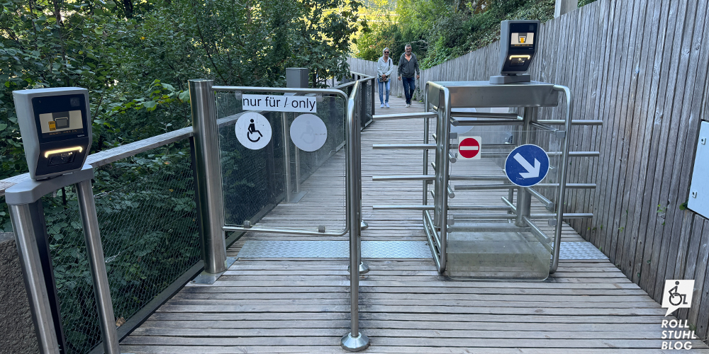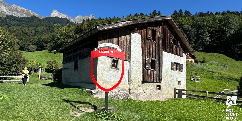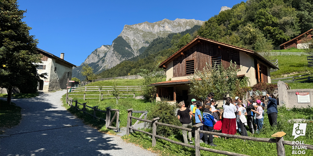Über einen schmalen Waldweg gelangen wir zum Besucherparkplatz. Ein Behindertenparkfeld suchen wir vergeblich. Wir fahren zuerst weiter nach oben zum Restaurant Heidihof… und sind skeptisch. Denn auch auf dem Restaurant-Parkplatz gibt es keinen Behindertenparkplatz, und wir sehen nur eine steile Treppe. Der Wirt zeigt uns den schmalen geteerten Weg am Ende des Parkplatzes, der zur Restaurant-Terrasse führt, und überraschenderweise gibt es eine moderne rollstuhlgängige Toilette. Und das Essen mit Bündner Spezialitäten – Capuns, Pizokel, Älplermagronen – ist grossartig. Vom unteren Parkplatz her laufen wir den Heidiweg entlang zum Heididorf. In der prallen Sonne geht es aufwärts und abwärts, so dass wir schon bei der Ankunft erschöpft sind. Und wir fragen uns, wieso nicht ein naher Behindertenparkplatz gebaut wurde, zum Beispiel beim Wohnhaus kurz vor dem Eingang, zu dem die Bewohner mit dem Auto fahren dürfen. Im Heididorf sind die Wege zu den meisten Häusern steil. Und in jedem Haus gibt es ein Drehkreuz, das nur mit gültigem Ticket passiert werden kann. Rollstühle passen natürlich nicht durch. Wir sind enttäuscht und verlassen das Heididorf schnell wieder. Fazit: Rollstuhlfeindlicher geht’s nicht.