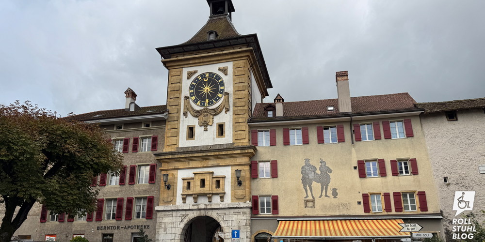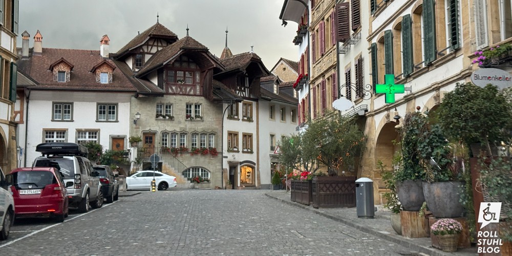 In Murten verbringen wir nur wenig Zeit, um einen Nidelkuchen zu kaufen. Eines fällt uns aber ganz stark auf: Immer wieder gibt es Rampen mit Rollstuhl-Symbol, die von der breiten Gasse in die erhöhten Laubengänge führen. Die hätten wir in Bern auch gerne.