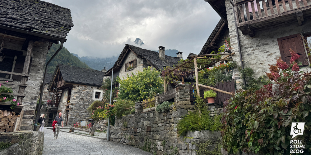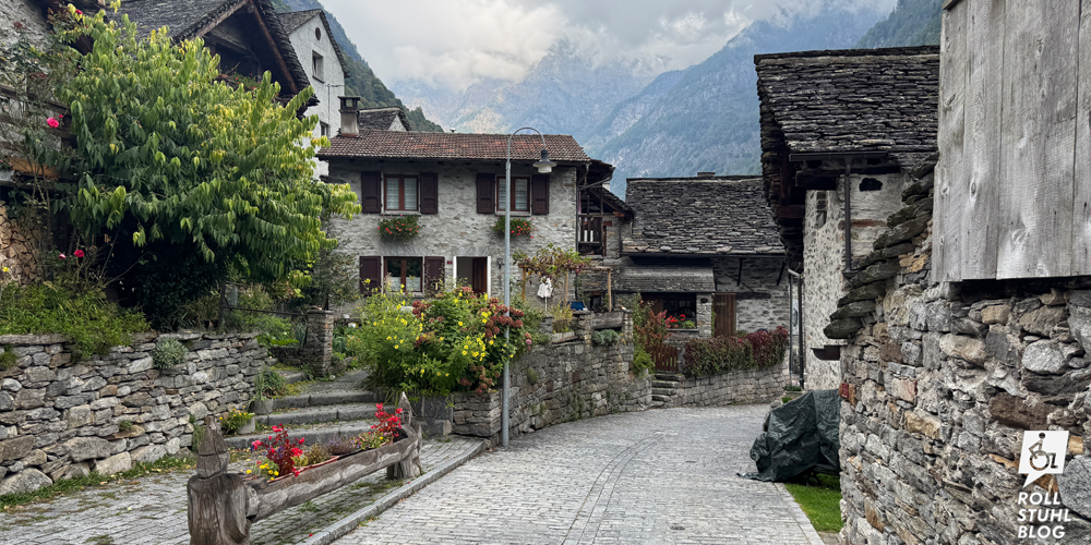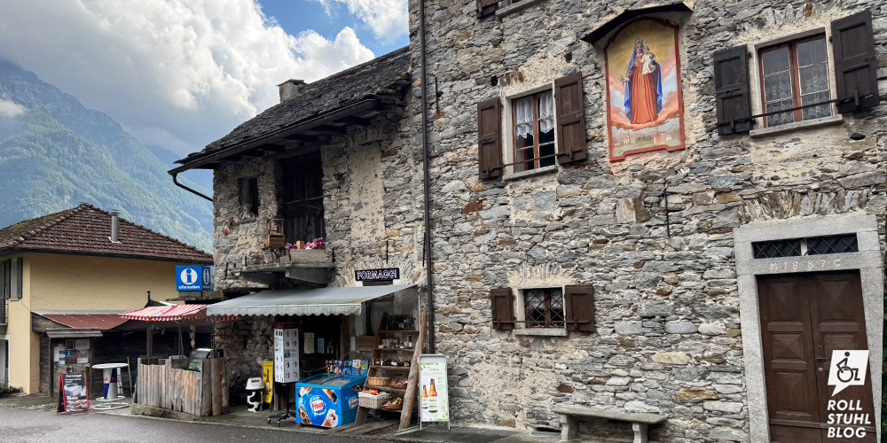 Zuhinterst im Verzasca-Tal liegt Sonogno. Auch dieses malerische Dorf mit seinen Steinhäusern ist autofrei. Auf dem grossen Parkplatz warten mehrere Behindertenparkplätze. Die Strässchen wurden wohl vor kurzem neu gepflastert und sind erstaunlich eben. Beim Gemeinschaftsofen verkaufen zwei Frauen frisch gebackenes Brot, und im kleinen Laden weiter unten bekommen wir ein schönes Stück Käse. So sitzen wir bald auf dem Mäuerchen rund um den Dorfplatz und essen ein improvisiertes Mittagessen. Wir haben uns gar nicht geachtet, ob es auch eine Behindertentoilette gibt, aber ziemlich sicher schon.