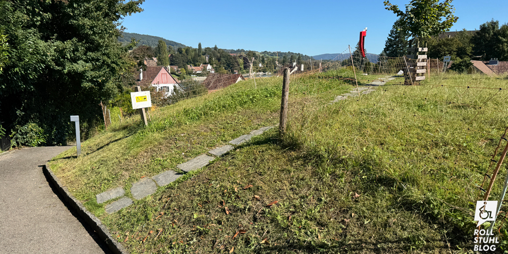 Nicht nur, dass der ganze Erlebnispark völlig rollstuhlfeindlich ist, siehe oben. Auch der Fotospot wurde so in einem Garten platziert, dass er nur über einen steilen Weg und Stufen erreichbar ist. Gegen einen anderen Standort hätte nichts gesprochen.
