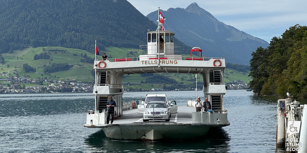 Der Fotospot auf der Autofähre zwischen Gersau und Beckenried auf dem Vierwaldstättersee befindet sich auf dem Aussichtsdeck, das nur über Treppen links und rechts erreichbar ist. Dasselbe gilt für die beiden Toiletten. Ein Lift ist nicht vorhanden. Und auch beim Warten gibt es zumindest in Gersau keine Behindertentoilette. Das Hotel-Restaurant Fähri hat zwar eine, doch das Verbotsschild und all das Gerümpel vor der Türe zeigen klar, dass hier niemand erwünscht ist.